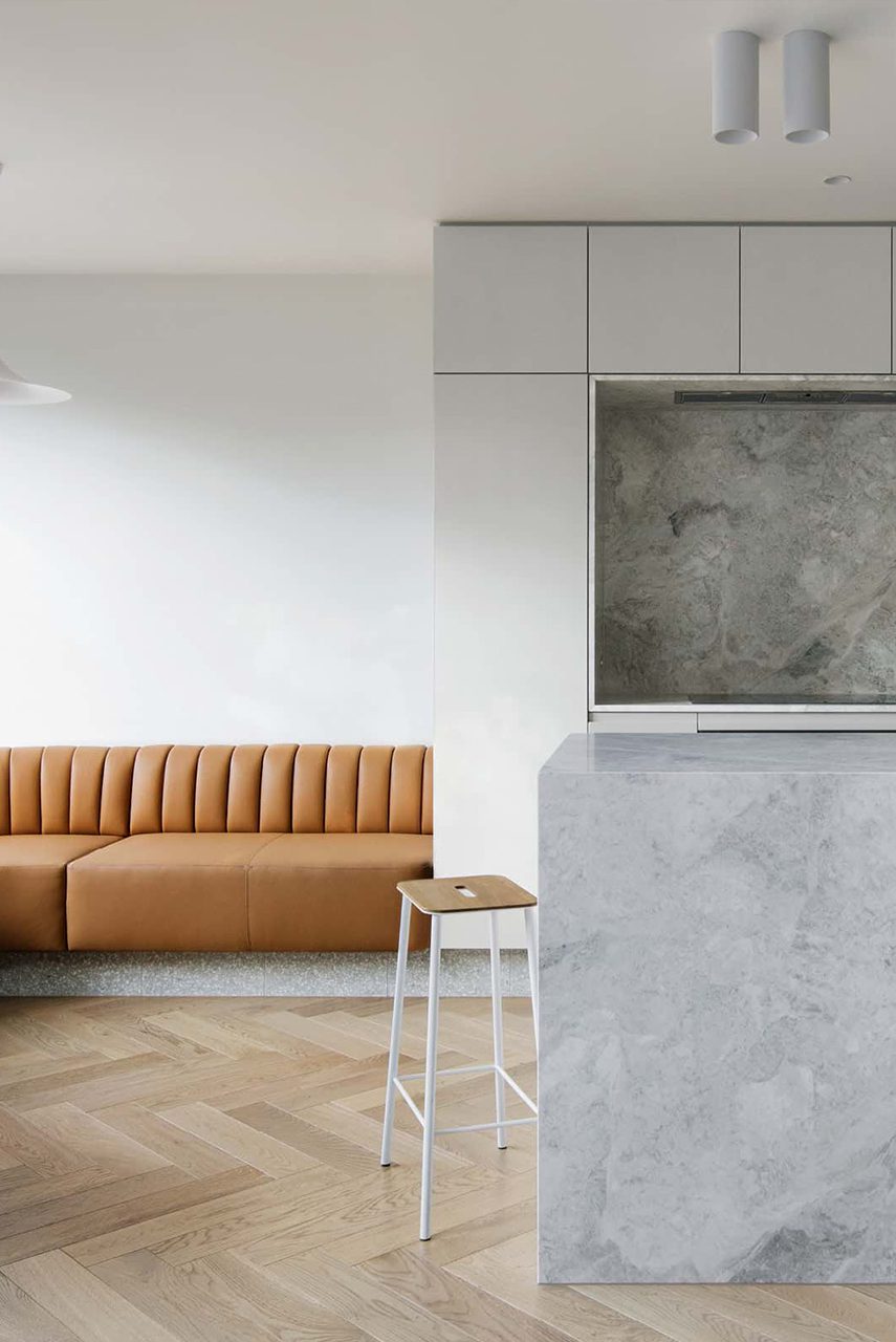 Our Cilindro ceiling mounted lights complement the mounted finishes in the kitchen, where natural stone and sleek joinery create minimalist functional space.