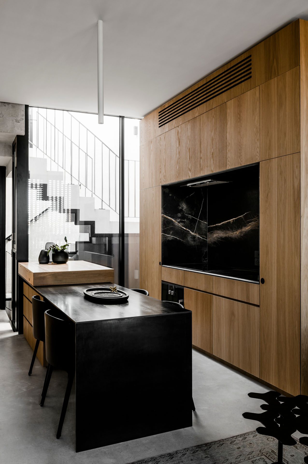The black steel and raw concrete palette is inspired by the urban context and working-class past of Collingwood, and the custom punctured and pressed aluminium façade cuts a bold silhouette in the eclectic streetscape. The closed façade provides privacy and creates a play of dappled light inside. Sliding back the operable shutters, the interiors open to expansive views and greater levels of natural light.