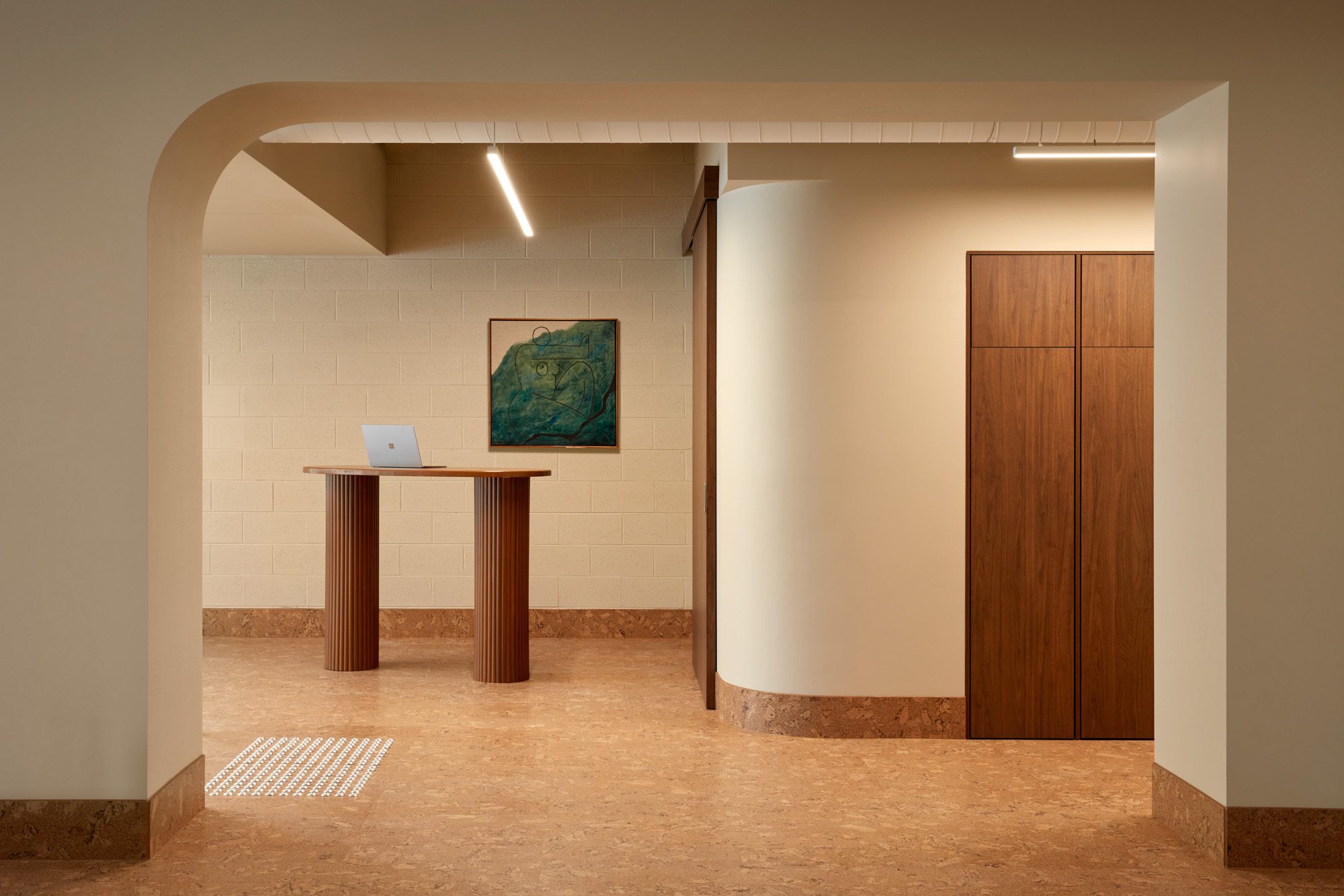 The fit-out is calm and grounding, featuring warm textures and earthy tones across two rooms for reformer pilates and mat pilates. Timber laminate, corked flooring and stone create a sophisticated, minimalist palette contrasted with sleek white details. Plaster buildouts cleverly conceal existing columns and services, whilst softening the space with gentle curves.