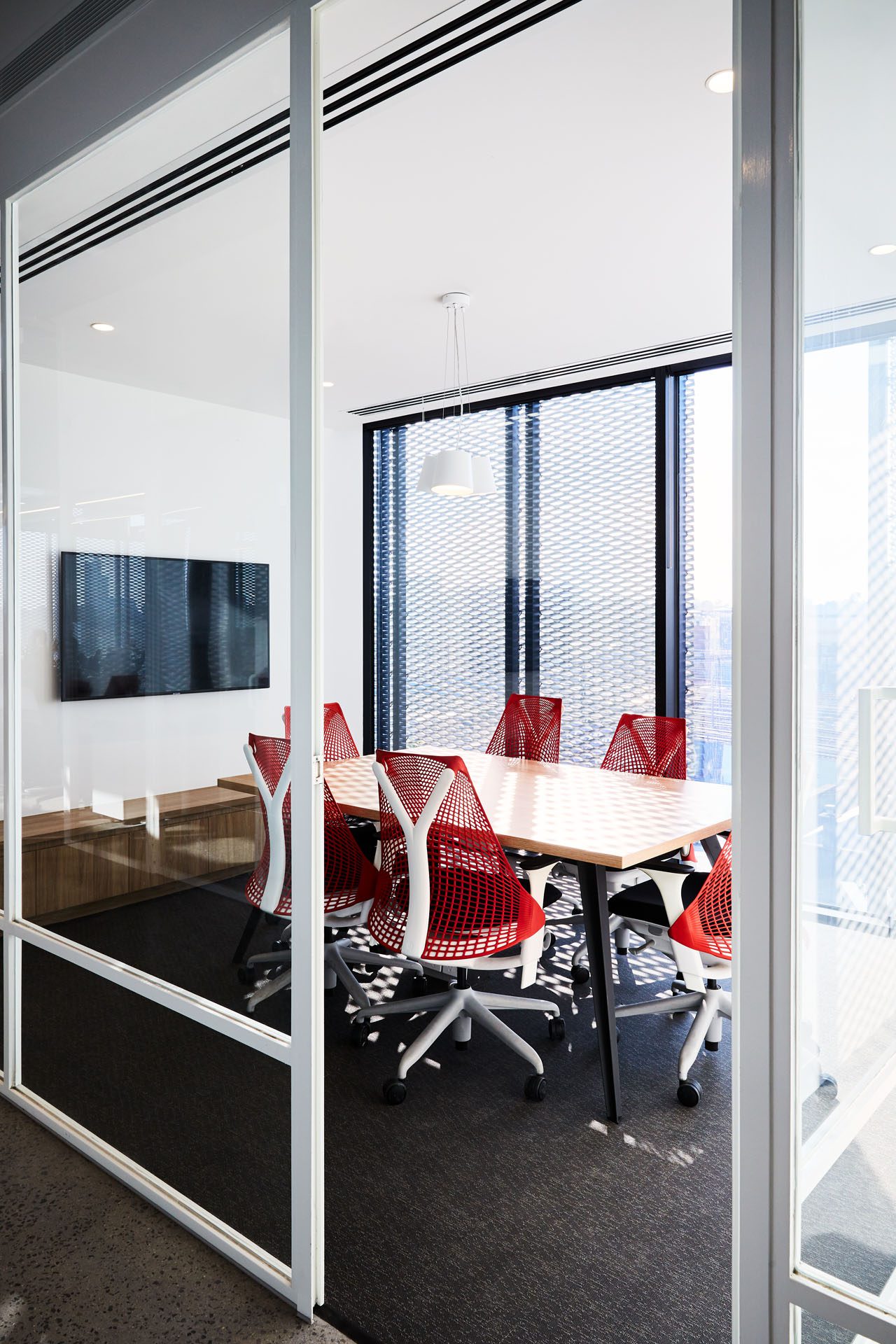The meeting rooms feature decorative downlighting. A custom rectangular timber pendant in the main conference room casts broad light across the table, while the Amak pendant is a sleek and modern interpretation of a traditional lampshade.