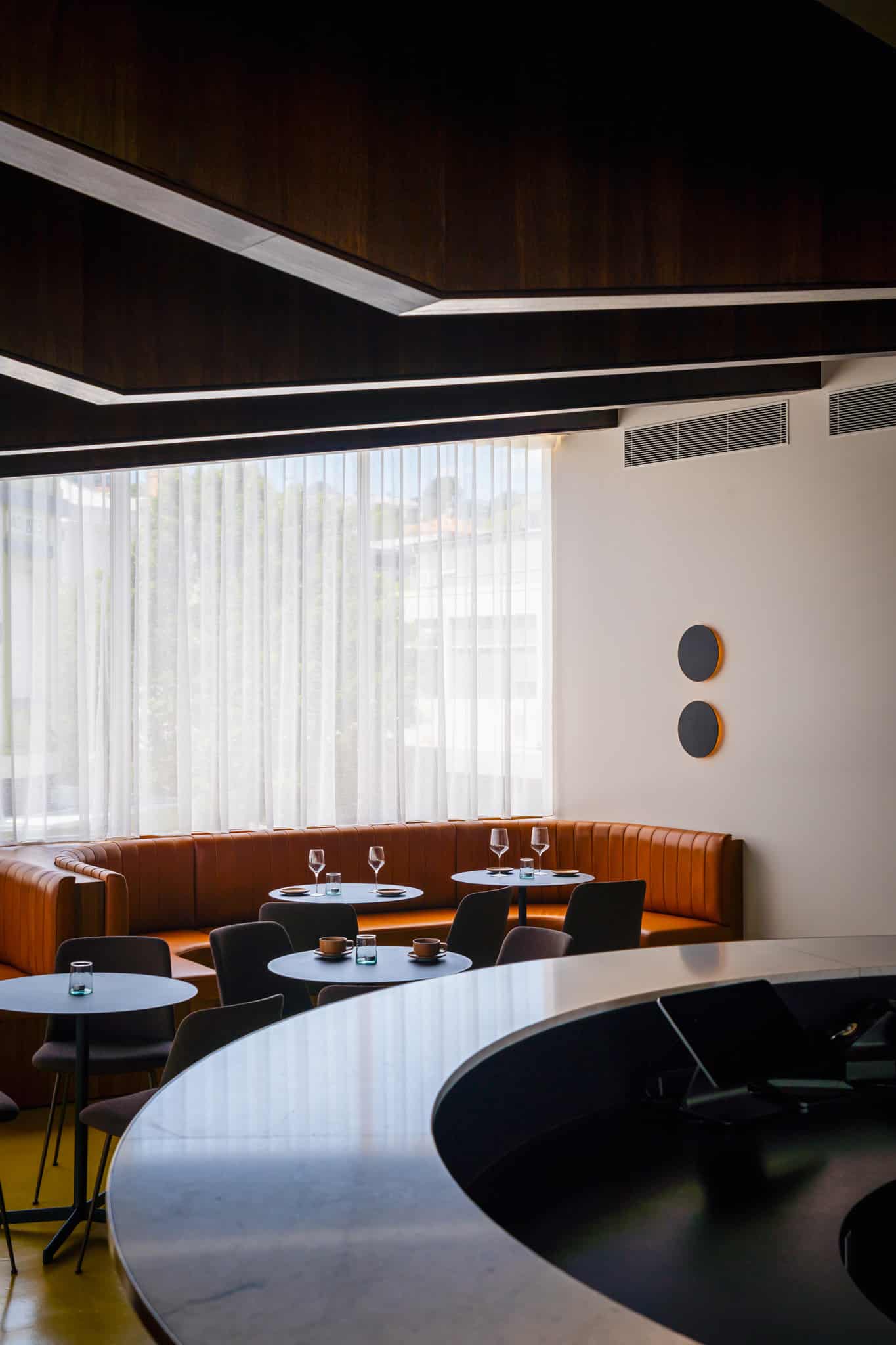 Located on the first floor of a 1960s building in Launceston’s St John Street, the Dill Pickle Club, designed by Workshop Architecture, is a unique listening bar dedicated to high-quality sound and the lingering enjoyment of music. To complement the hi-fidelity experience, the interior blends multiple design influences—dark blackwood-lined trusses that recall Eastern Bloc modernism, the warm luxury of a jazz age speakeasy, and subtle nods to vintage audio like gold records and reel-to-reel tape players. Together, these elements create a rich, atmospheric space that transports guests while offering stunning elevated views.