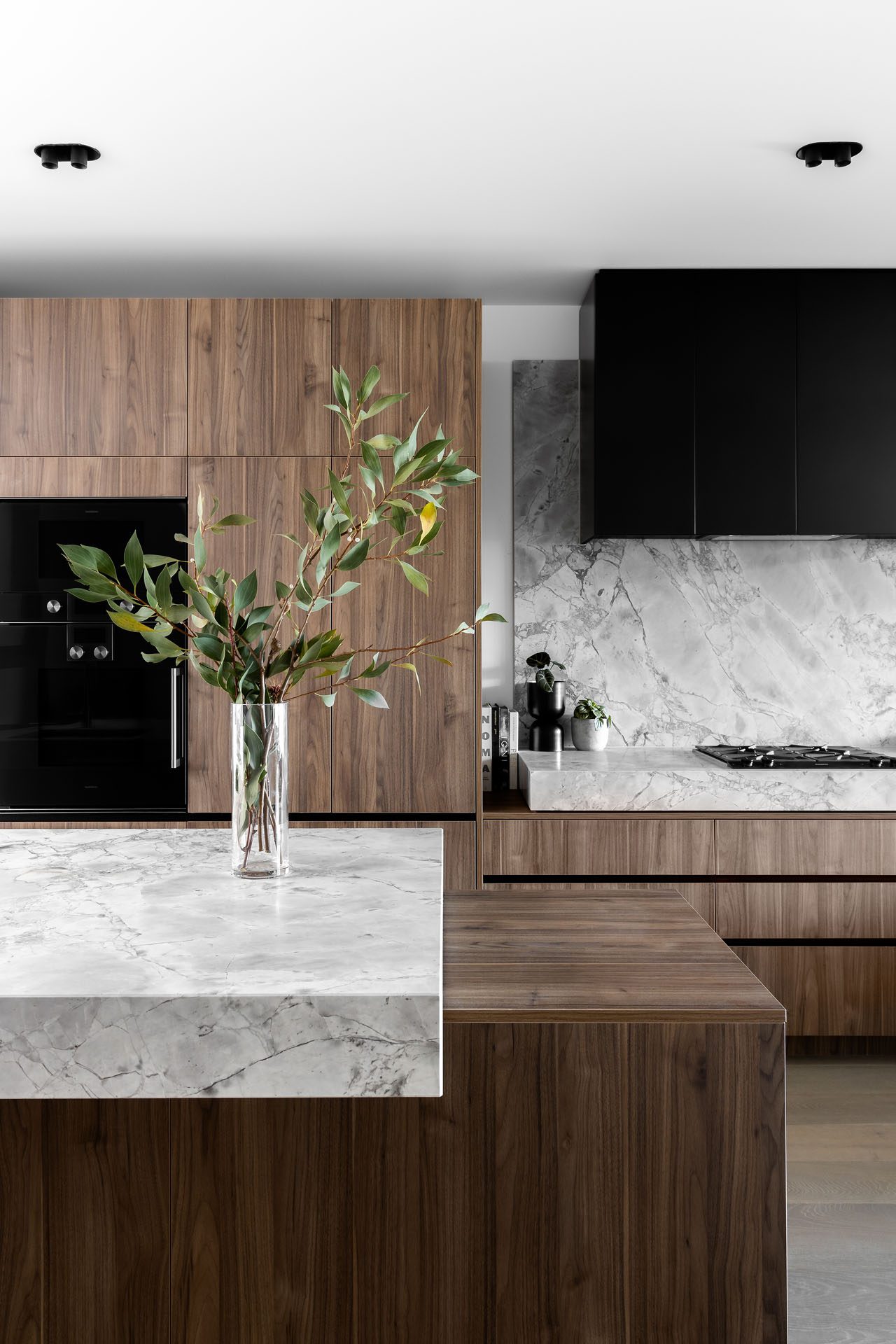 The palette of natural and tactile materials, such as stone, warm timber and brushed gunmetal, reference the site’s past. The palette makes an impact in the kitchen and bathrooms, where the intricate mottled grey veining of the monolithic stone slabs is put under the spotlight – Sphera’s Okki Single and Double downlights.