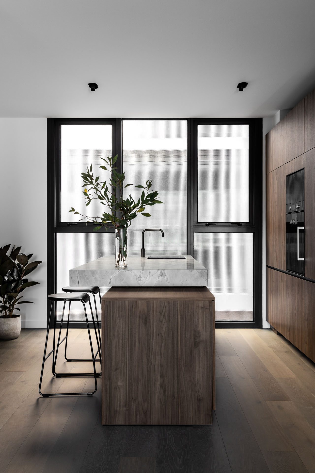 Spanning five storeys, the interiors offer ample space for socialising and entertaining, while also providing spaces for family life, privacy and a sense of retreat. The verticality of the architecture brings abundant natural light into each room, with fluted glass panes diffusing the light for privacy in the bathroom and kitchen.