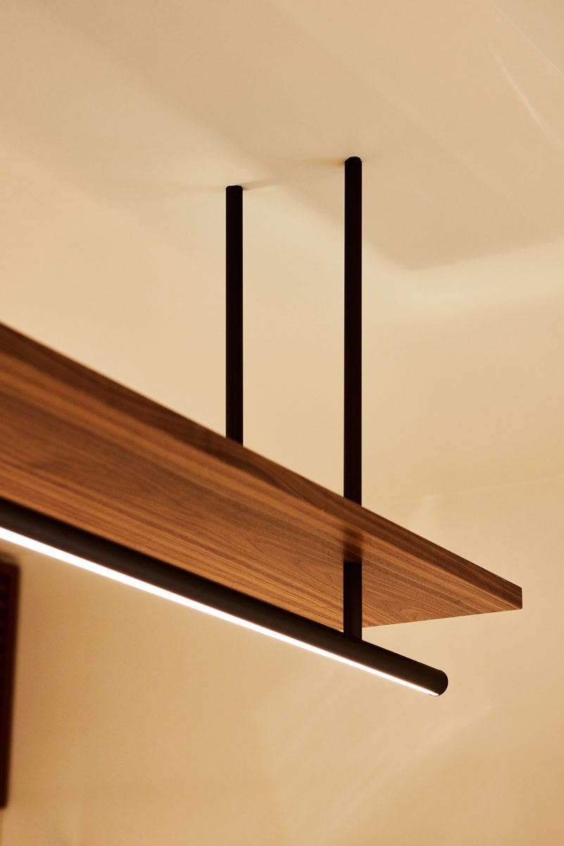 A range of Sphera lighting completes the fit-out, including custom Giotto wall mounted to timber panelling. Custom Profilo Round lights integrate with timber shelves, speaking to the design language and materiality within the space, alongside Zinco and Cerkio Large.