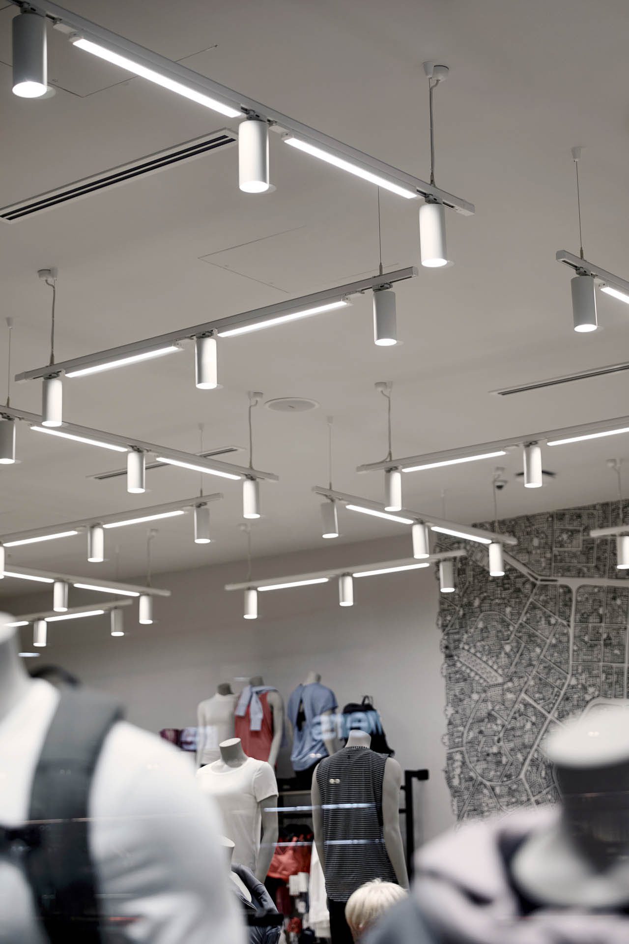 The tracks in the Emporium store are mounted directly to the ceiling and consist of Integra in the centre and Zinco at each end, angled to highlight the product racks and merchandising displays. Tracks of Zinco lights also surround the store windows to spotlight the clothing.