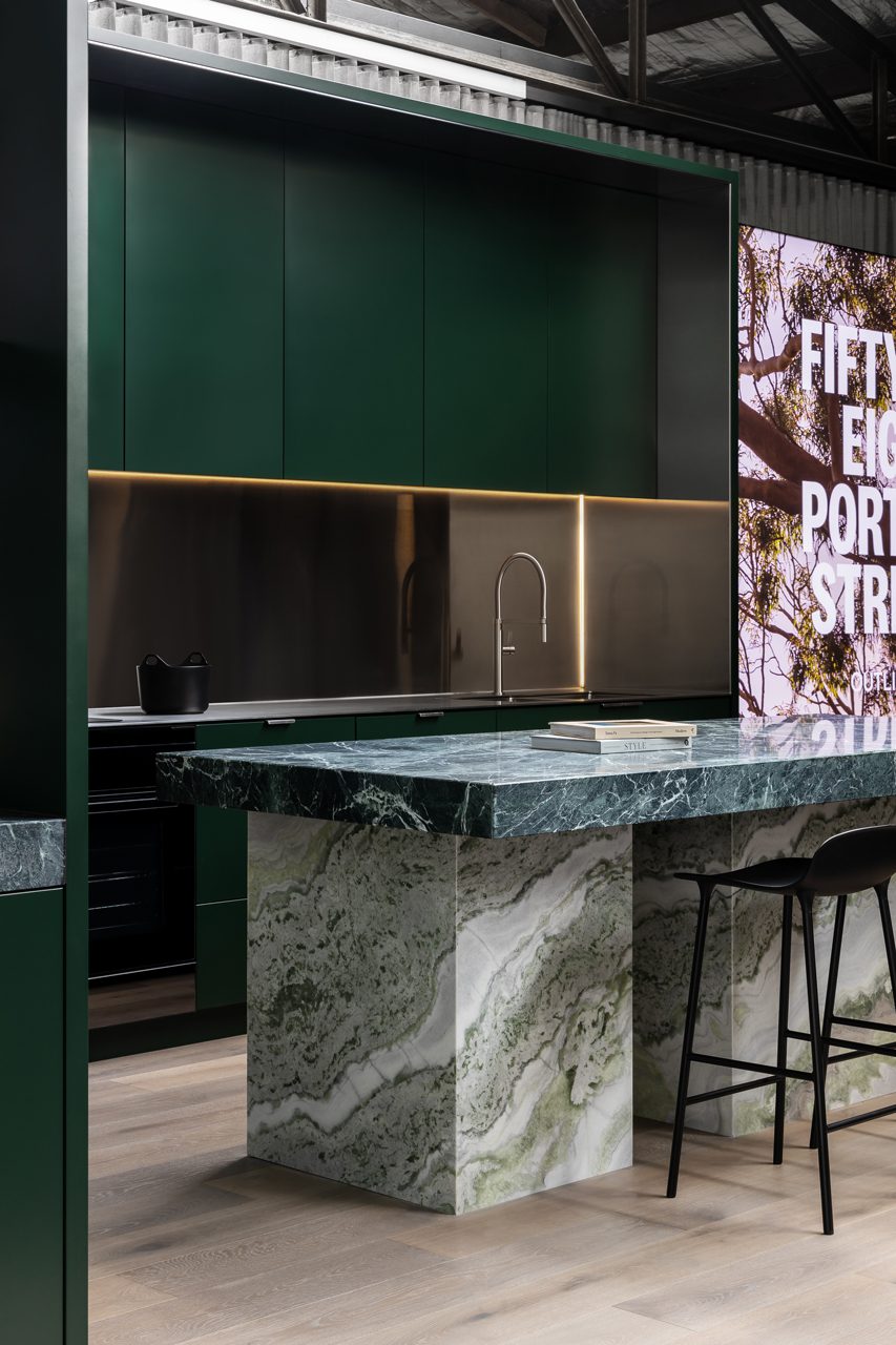 Fifty Eight Porter Street by Outline Projects is a series of apartments in Prahran, designed to echo the industrial history and green spaces of its inner-city neighbourhood. Following from Outline’s legacy of projects, the building is designed to be carbon-neutral. Designed by Cera Stribley Architects, the display suite features the key elements of the generous-sized apartments. The materiality makes reference to the urban context, featuring refined stone textures, stainless steel and warm green joinery creating sophisticated, contemporary spaces.
