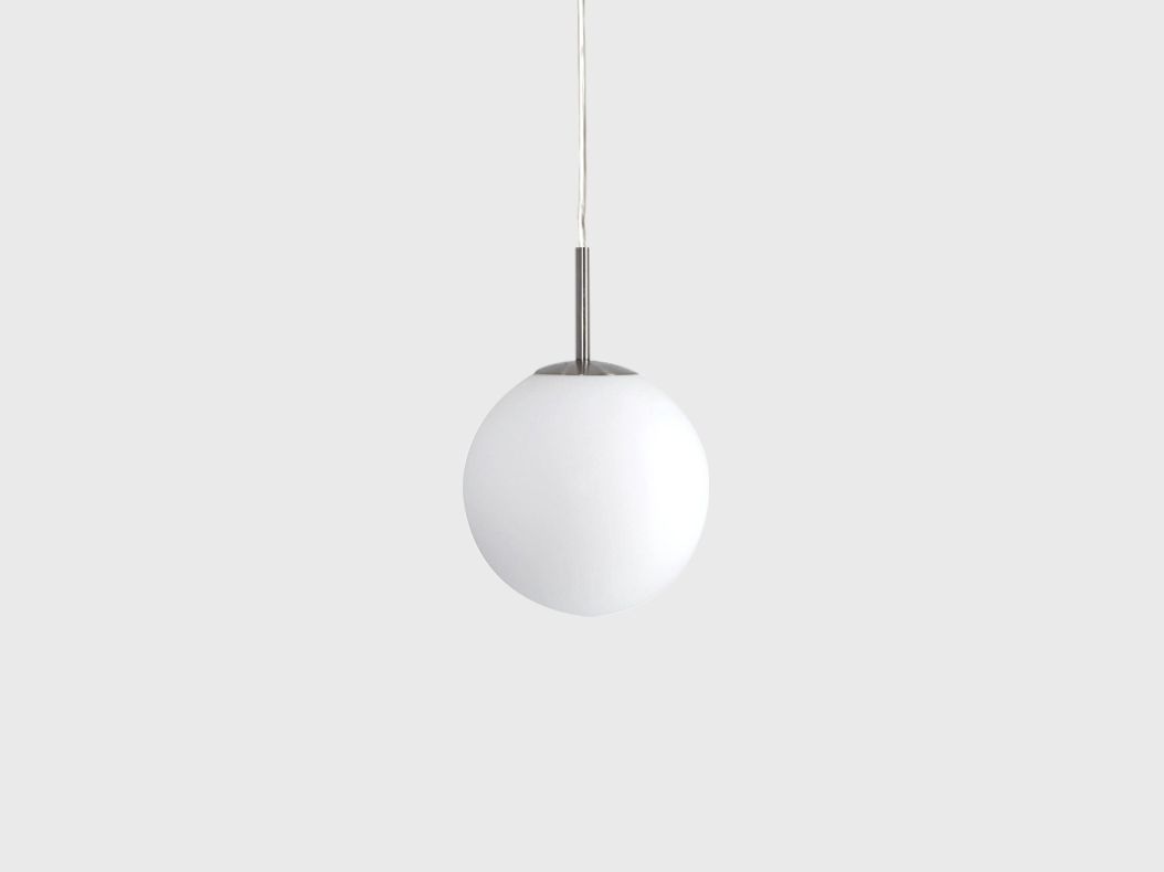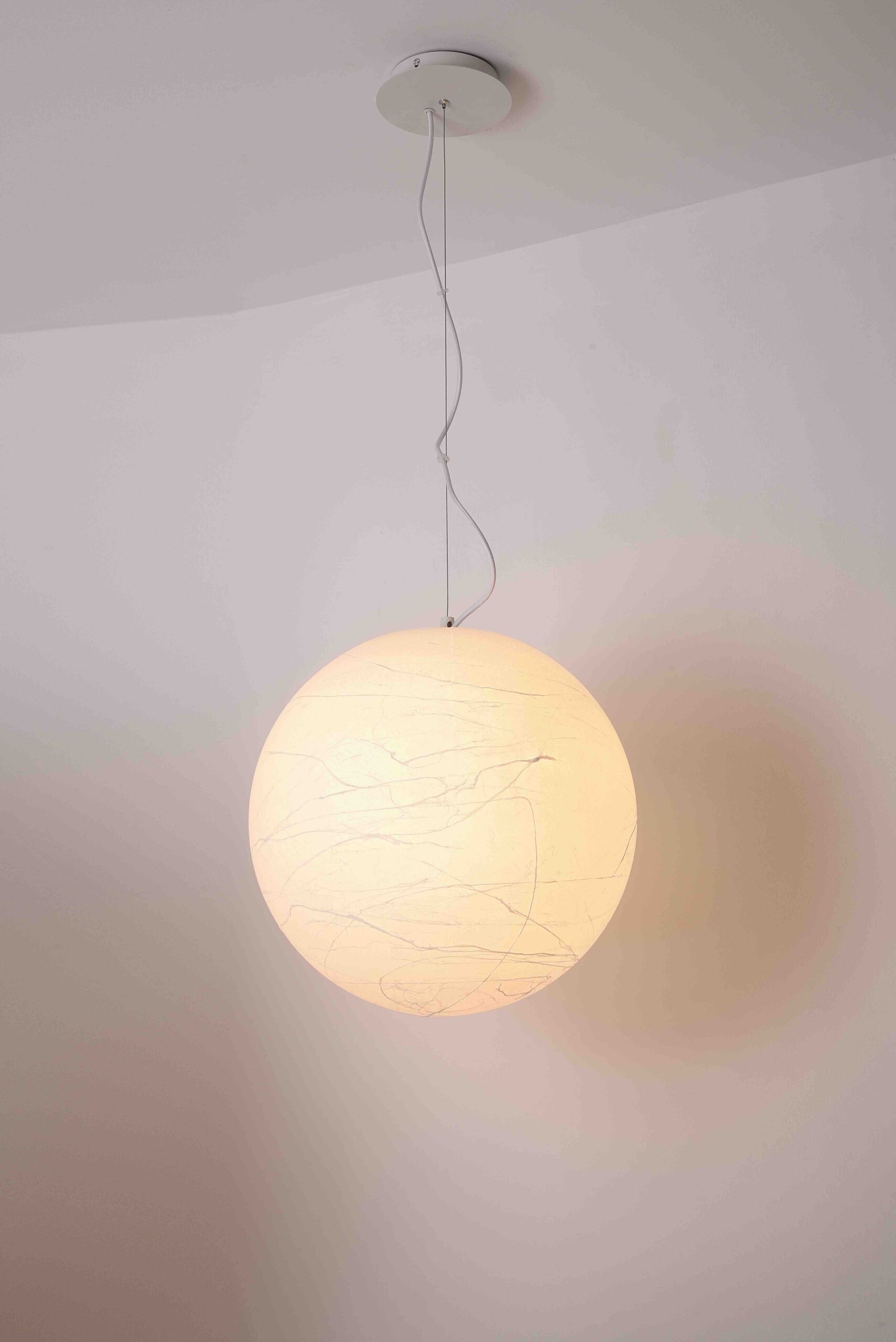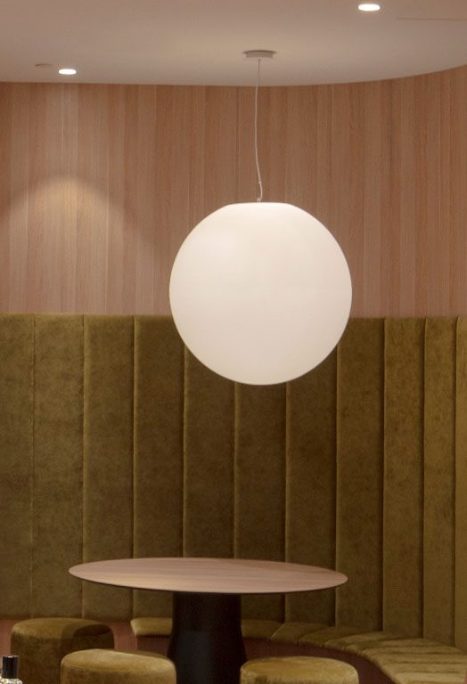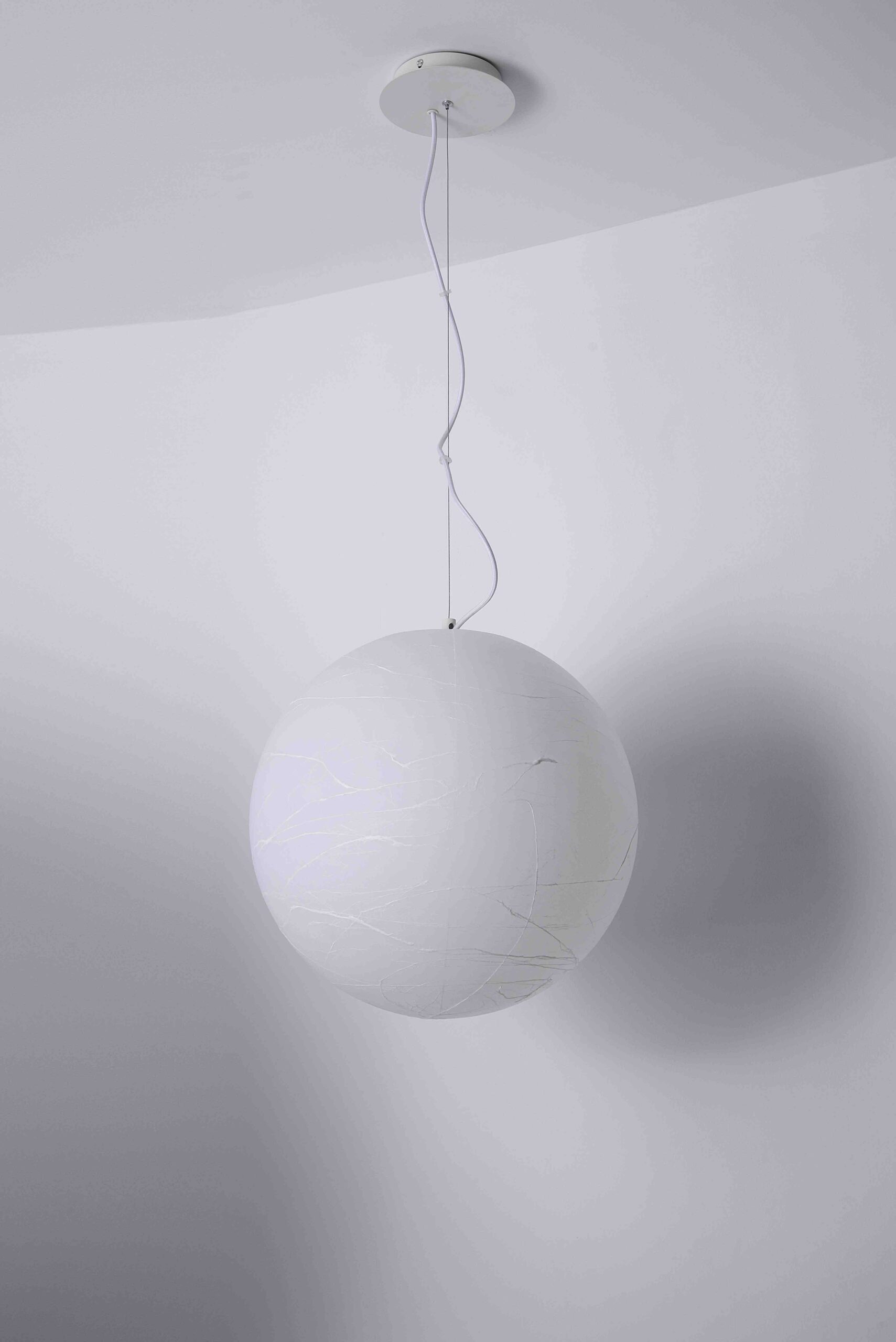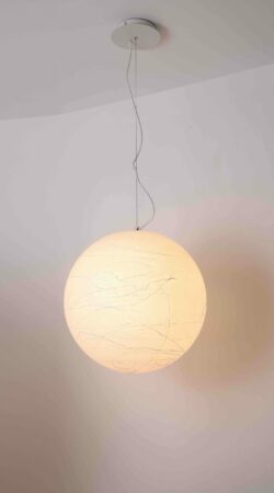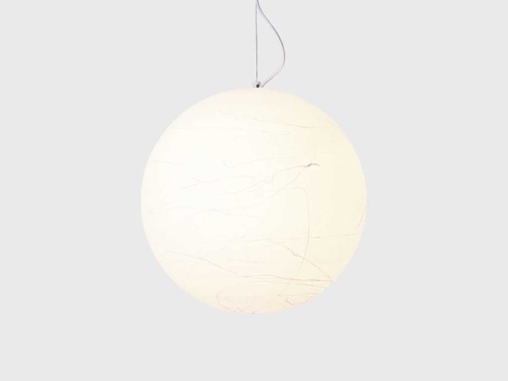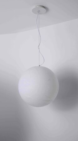 Europa is a pendant comprising a diffuser made of a large textured acrylic sphere with a thin fibre pattern that resembles a paper lantern providing an ideal, evenly diffused light and light appearance. Its supporting structure is an Aluminium hidden plate with a white braided cord, the suspension system can be painted in any custom colour. The minimalistic design of the Europa pendant makes it ideal for most residential applications and is also suitable for hospitality and commercial areas.