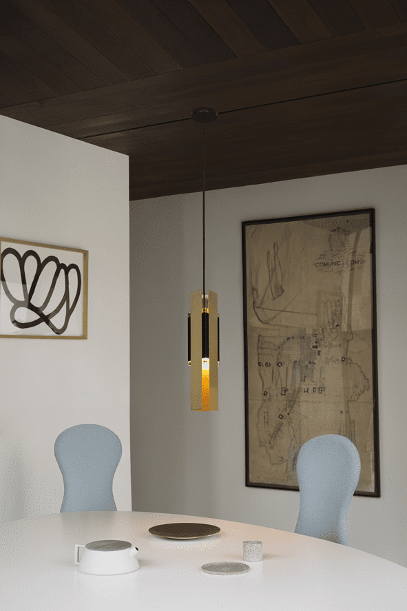 A slightly Deco inspired hanging lamp with a triangular base. The main body is in black coating and the light is spread through 2 plexiglass prisms and it’s wrapped into 3 rectangular brushed brass foils. It is available in different compositions: single or bunch suspension, chandeliers in two different dimension, single or double wall lamp.