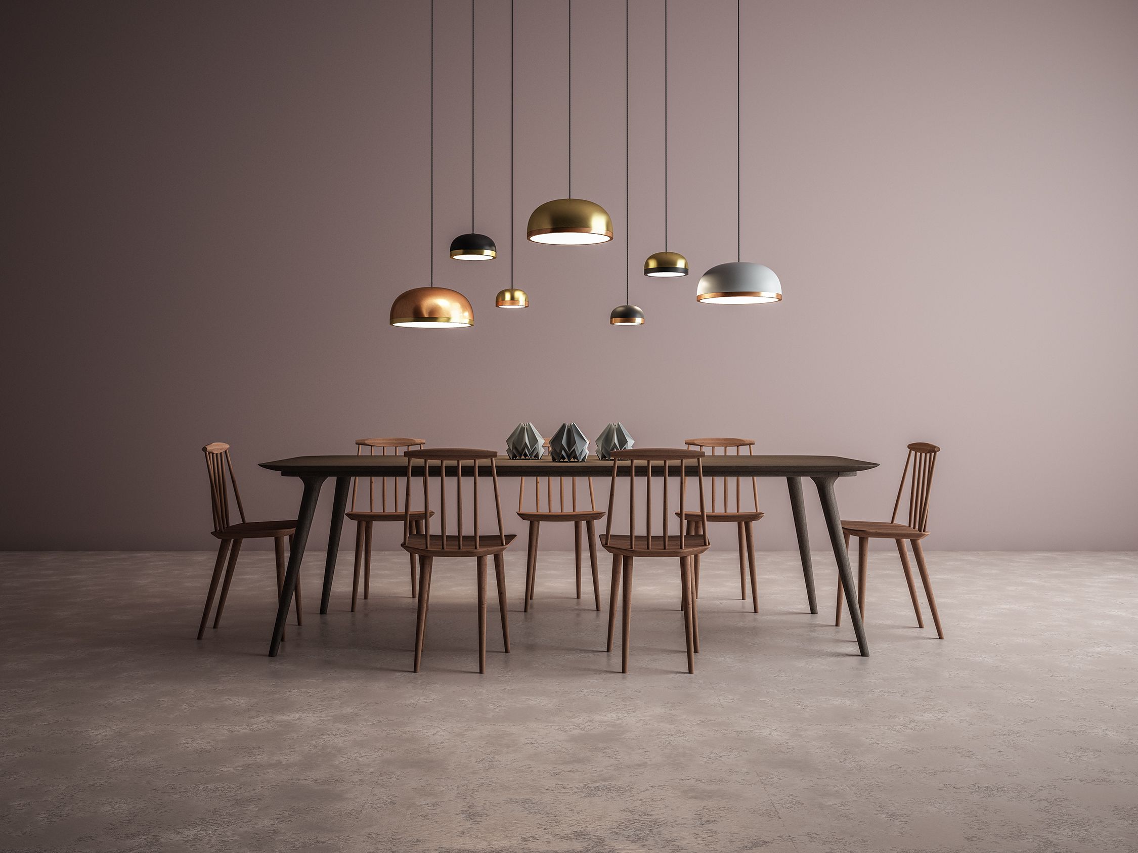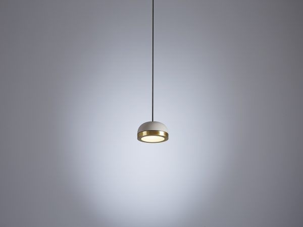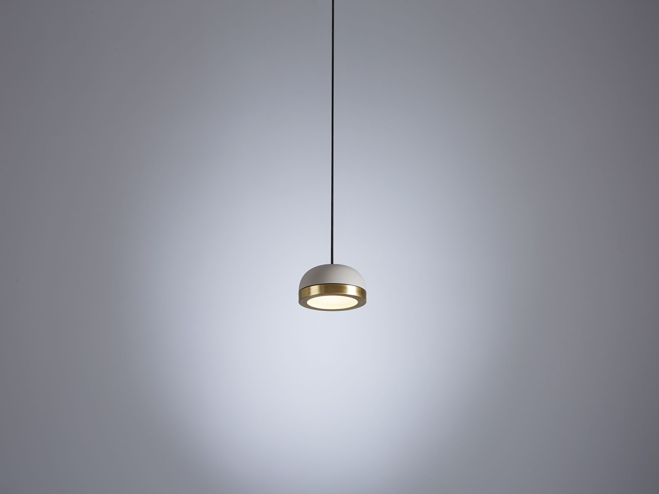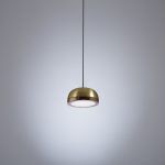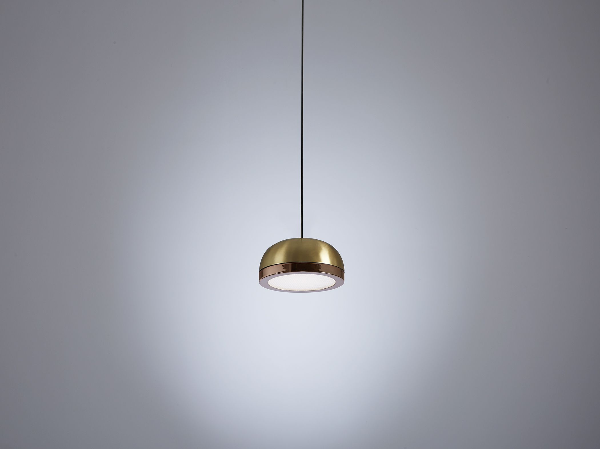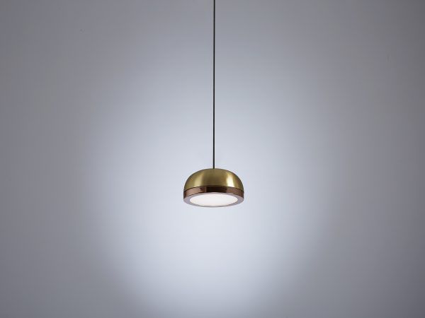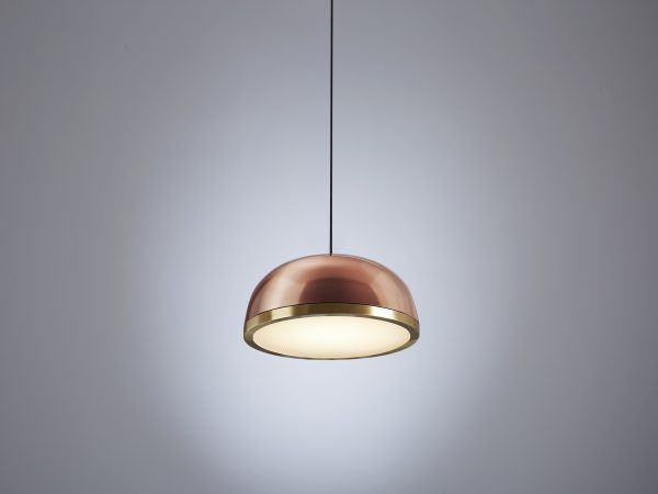Collection of contemporary hanging, wall, floor, table, side and ceiling lamps with a painted dome and ring either painted or finished with brushed brass or galvanic copper. The bright diamond screen is made of plexiglass to better spread light out. The collection presents lamps available in three sizes for single-unit or dynamic compositions. These lamps are very versatile and fit any kind of setting, thanks to their simple shape yet rich materials.