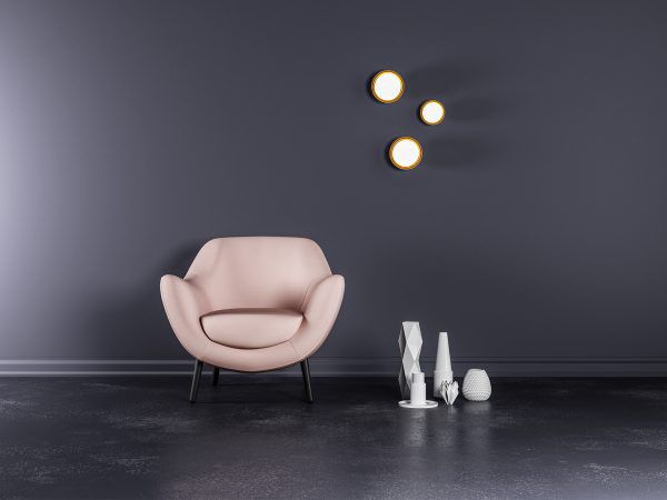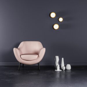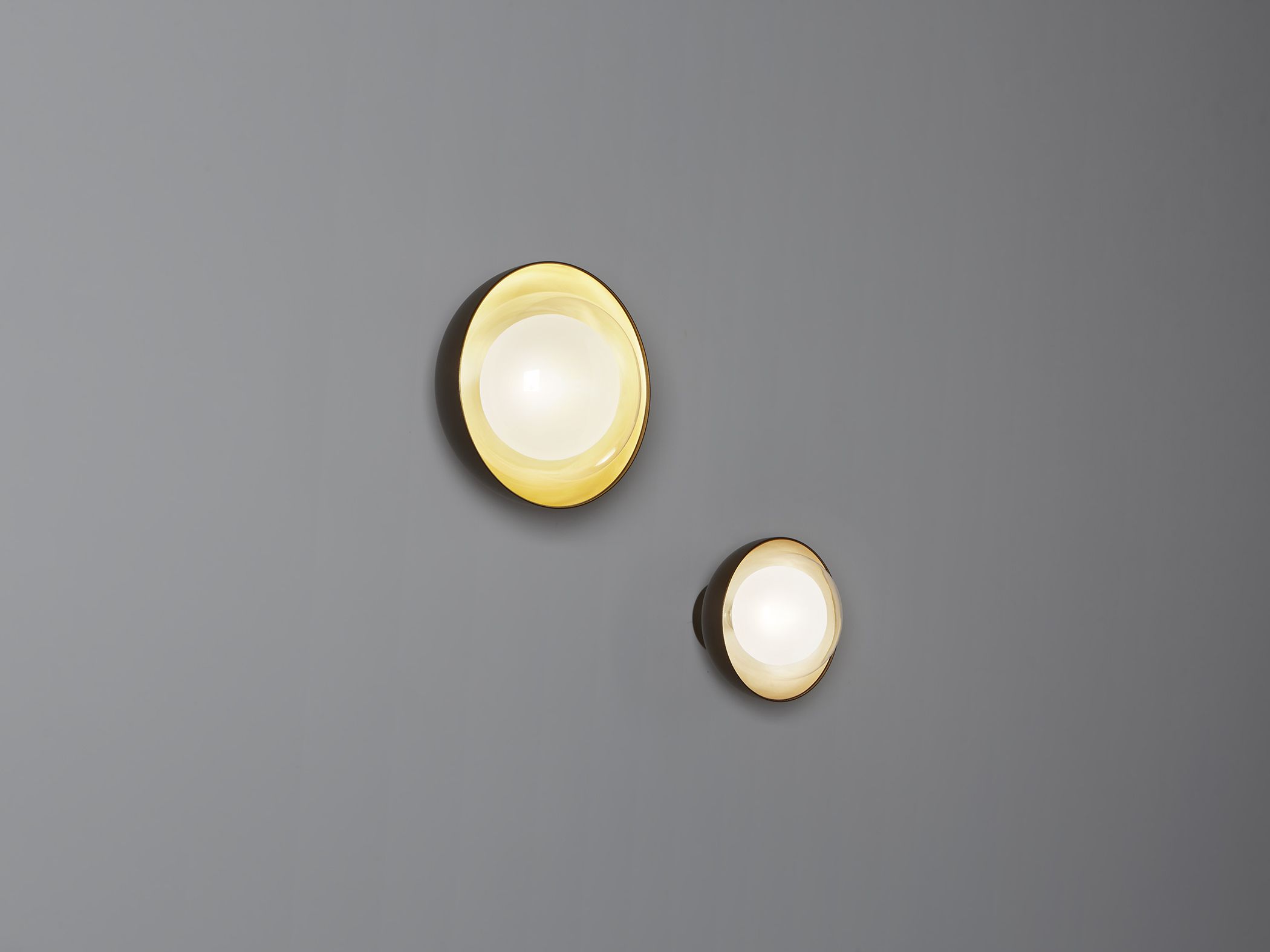 Collection of neo-vintage metal lamps with a double-sided diffuser in borosilicate glass. The metal domes (one internal and the other one external) have the internal side with different colors or finishing: they can be painted or finished in polished brass and bright copper, thus to create different textural combinations. The collection presents hanging lamps, floor lamp, table lamp, wall and ceiling. The hanging and wall lamp version are provided with a further G9 source located in the lower part of the lamp.