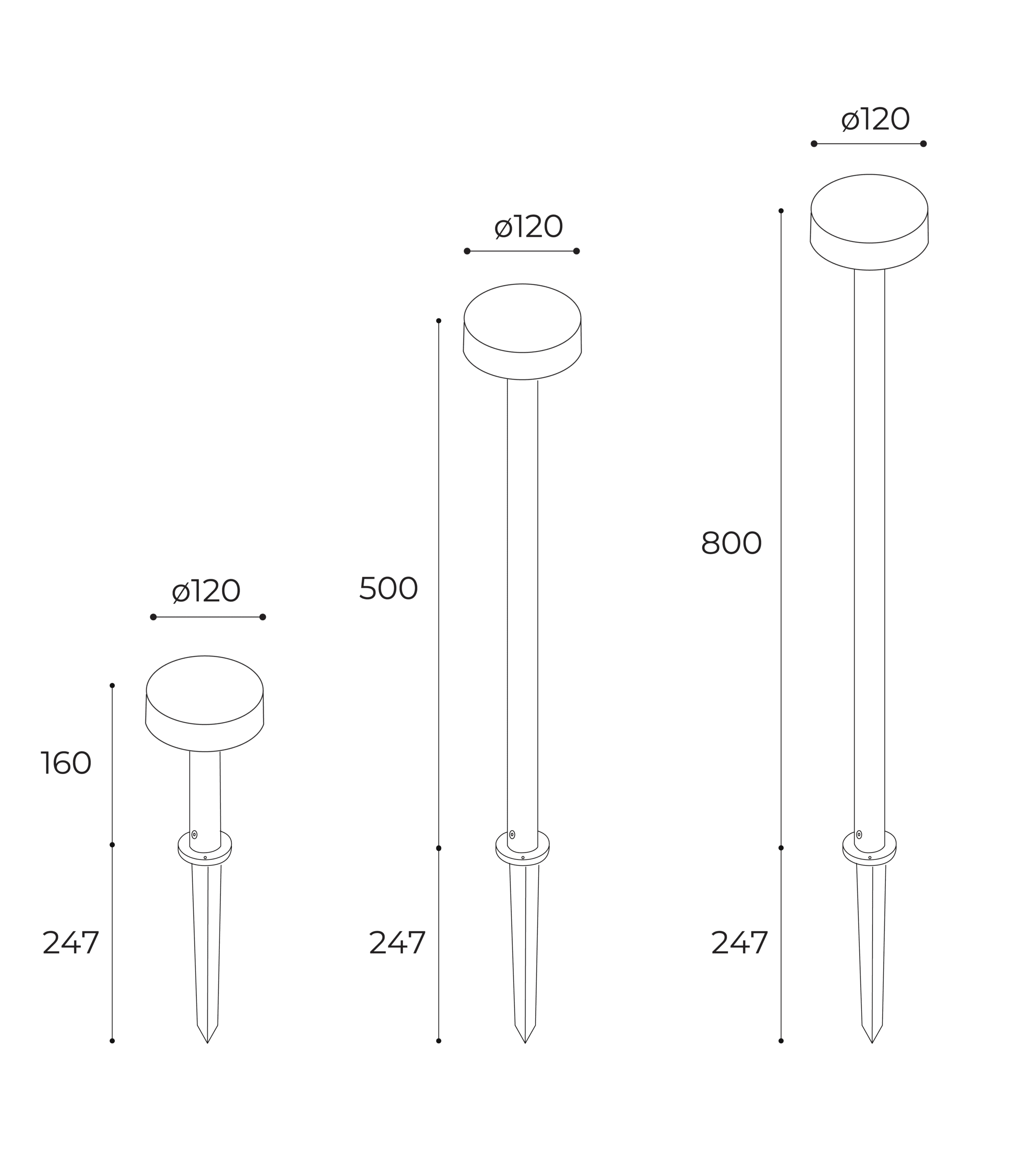 Available in three heights—160mm, 500mm, and 800mm—Sofia offers flexibility in scale and application. Mounting options include a base for solid surfaces or a spike for soft ground, allowing for effortless integration across diverse outdoor settings.
