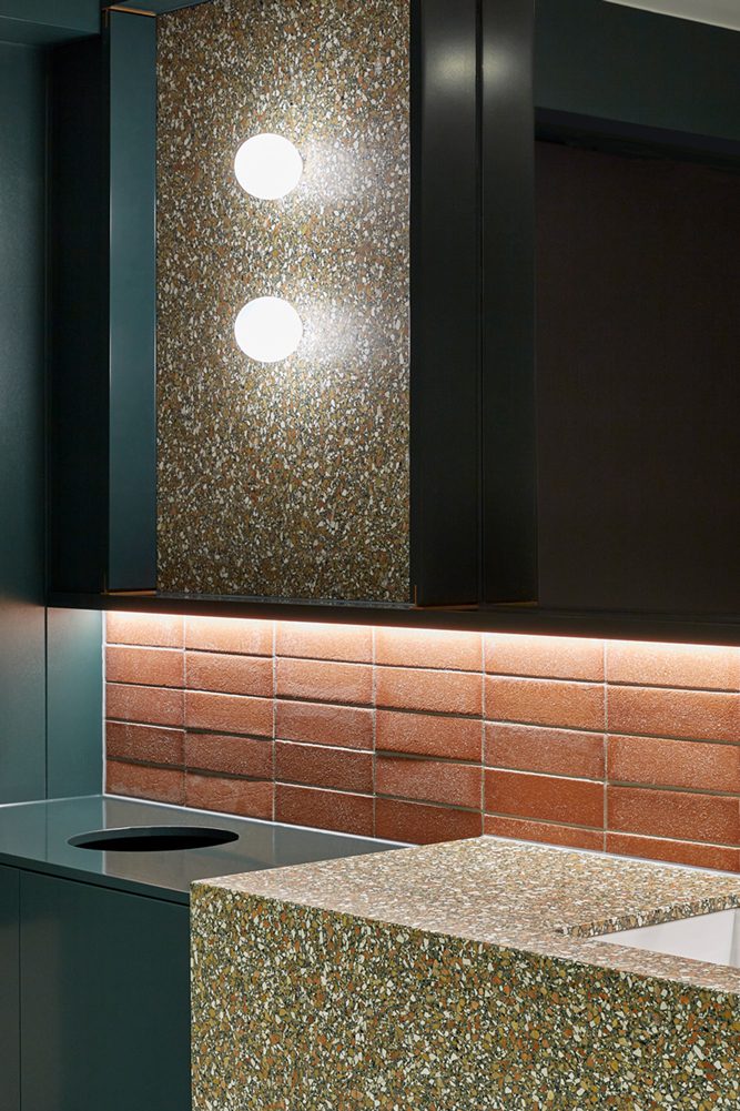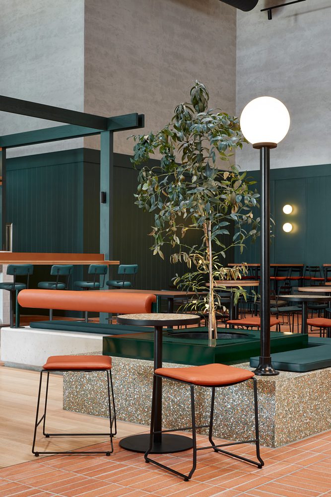 A warm palette of earthy tones and cool greens enlivens the vibrant space, paired with natural textures of timber, terrazzo, brick and concrete. Exposed industrial elements create an urban atmosphere. The space is illuminated with a range of Sphera lighting products. Custom Palla mounted on pole feature throughout the main space. O-lamp, Ring Pendant, Zinco, Binario and Prado create a decorative and functional lighting solution with a warm ambience.
