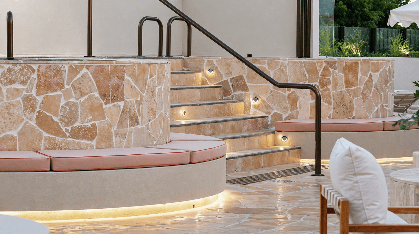 At a lower level, linear strip lighting is concealed within steps and seating edges, introducing a subtle horizontal layer of light. This not only improves wayfinding but adds depth and definition to the forms, particularly as the space transitions into evening.